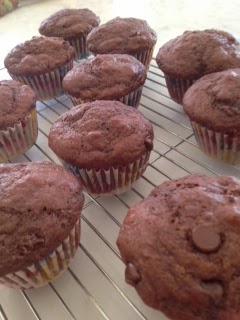 So we decided to make these Chocolate Brownie Yogurt Muffins (no nuts, I promise). I got this recipe from a quinoa cookbook that I have, although I made many alterations. First of all, I didn't have quinoa flour- I used regular all purpose. Second, I didn't have sour cream- I used Greek yogurt and third, I didn't include the toasted nuts, for obdvious reasons. But I have to say, even with all the changes I made, they turned out pretty good. They're not too sweet because of the cocoa powder and they are really moist because of the yogurt. Pretty impressive. The kids and the adults liked them. I will definitely make them again!